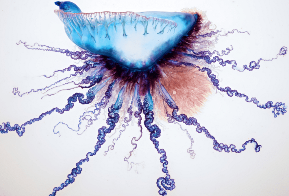 Unlike many other marine animals, it has no head, brain, gills or skeleton. Instead, it has a float, and thousands of appendages. Although it looks like a jellyfish and is often mistaken for one, P. physalis is actually a siphonophore, a colony of highly specialised hydrozoan animals called zooids, which forms its long appendages.
